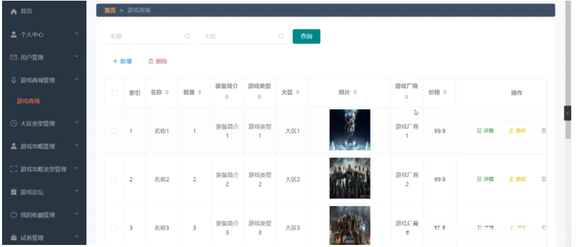 游戏商城管理,在游戏商城管理页面中可以查看索引、名称、数量、装备简介、游戏类型、大区、照片、游戏厂商、价格等信息,并可根据需要进行修改或删除等操作,如图5-12所示。