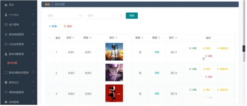 游戏攻略管理,在游戏攻略管理页面中可以查看索引、名称、类型、照片、难度、视频、简介等信息,并可根据需要进行查看评论、修改或删除等操作,如图5-14所示。