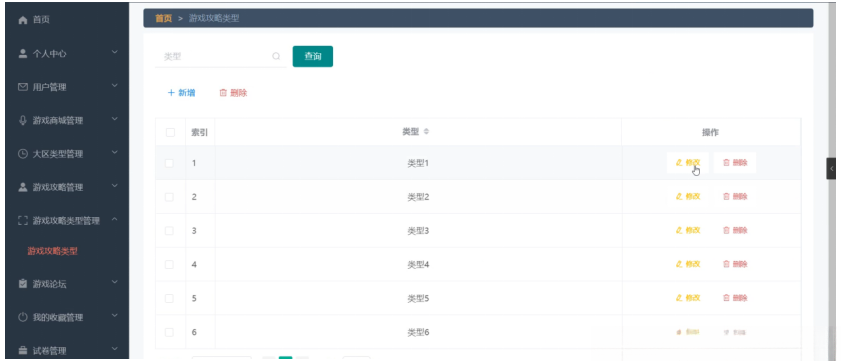 游戏攻略类型管理,在游戏攻略类型管理页面中可以查看索引、类型等信息,并可根据需要进行修改或删除等操作,如图5-15所示。
