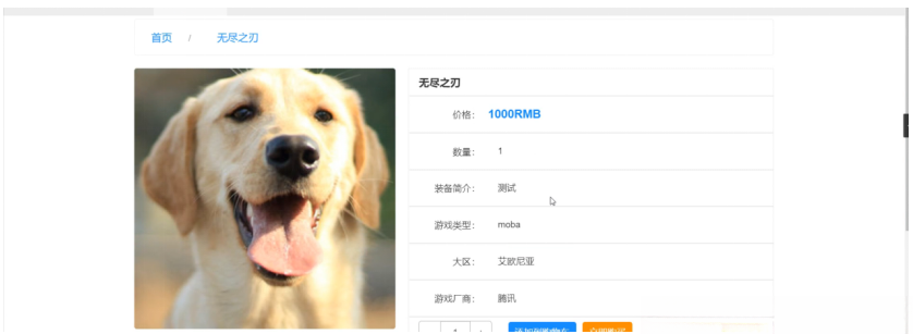 游戏商城,在游戏商城页面可以查看名称、数量、装备简介、游戏类型、大区、照片、游戏厂商、价格等信息,进行添加到购物车、立即购买,如图5-3所示。