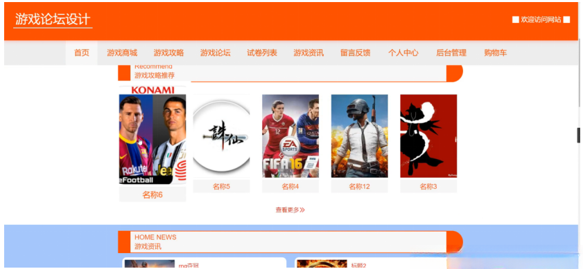 游戏论坛设计,在系统首页可以查看首页、游戏商城、游戏攻略、游戏论坛、试卷列表、游戏资讯、留言反馈、个人中心、后台管理、购物车等内容,如图5-1所示。