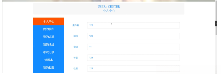 个人中心,在个人中心页面通过填写用户名、网名、密码、年龄、性别、手机、邮箱、个人简介、余额等信息进行更新信息,根据需要对我的发布、我的订单、我的地址、考试记录、错题本、我的收藏进行相对应操作,如图5-8所示。