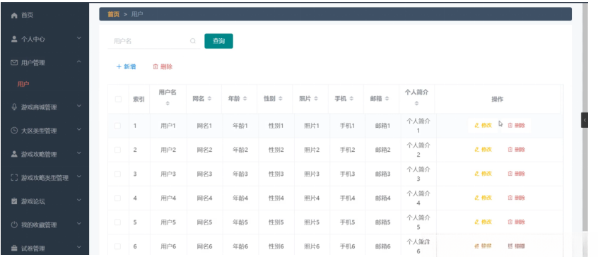 用户管理,在用户管理页面中可以查看索引、用户名、网名、年龄、性别、照片、手机、邮箱、个人简介等信息,并可根据需要进行修改或删除等操作,如图5-11所示。