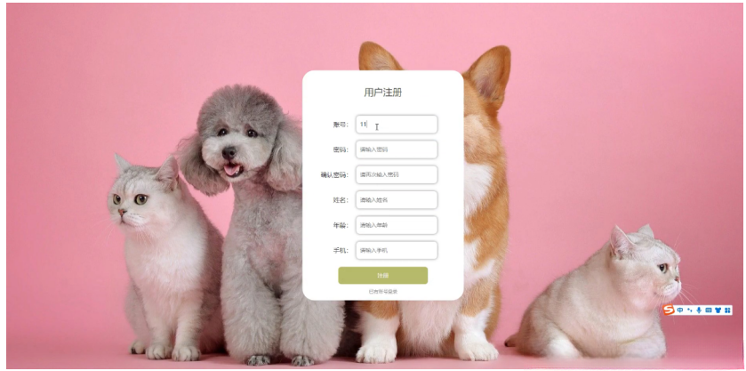 用户注册,在用户注册页面通过填写账号,密码,确认密码,姓名,年龄,手机等信息进行注册操作,如图5-2所示。