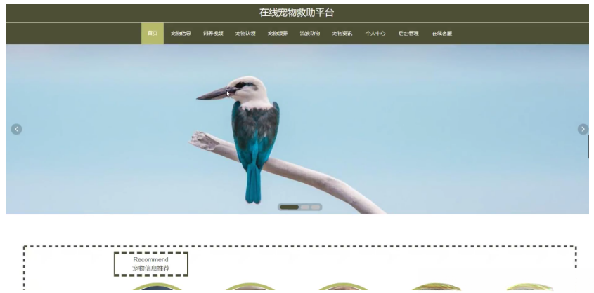 在线宠物救助平台,在平台首页可以查看首页,宠物信息,饲养视频,宠物认领,宠物领养,流浪动物,宠物资讯,个人中心,后台管理,在线客服等内容,并进行详细操作;如图5-1所示。