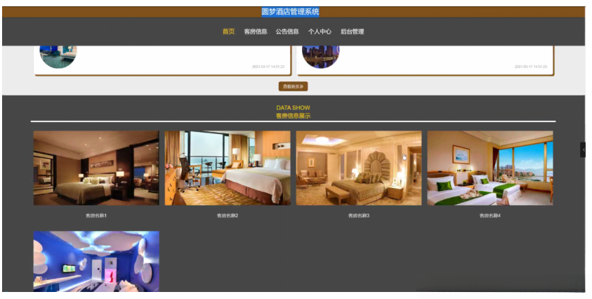 圆梦酒店管理系统系统,在系统首页可以查看首页、客房信息、公告信息、个人中心、后台管理等内容进行详细操作,如图5-1所示。