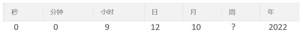 2022年10月12日上午9点整 对应的cron表达式为:0 0 9 12 10 ? 2022