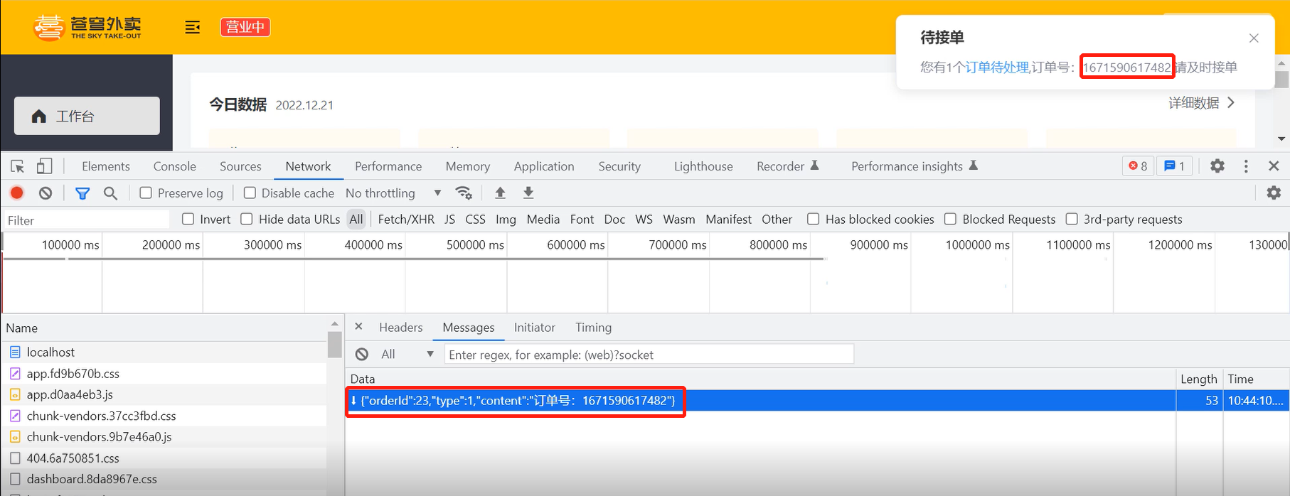 客户端浏览器解析服务端推送的消息,判断是来单提醒还是客户催单,进行相应的消息提示和语音播报 约定服务端发送给客户端浏览器的数据格式为JSON,字段包括:type,orderId,content