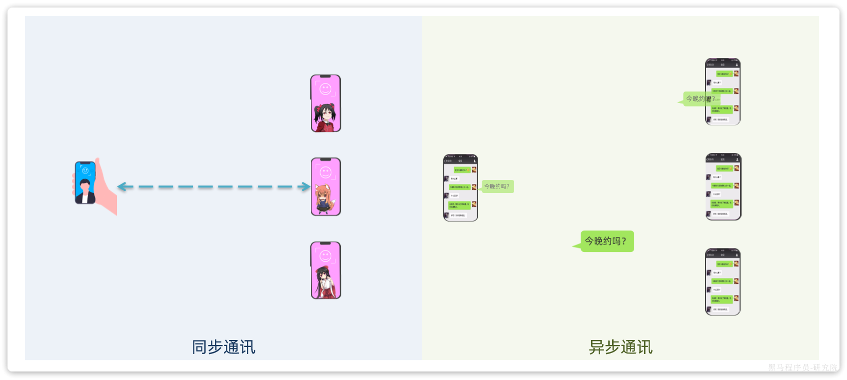 异步通讯:就如同发微信聊天,双方的交互不是实时的,你不需要立刻给对方回应。因此你可以多线操作,同时跟多人聊天。