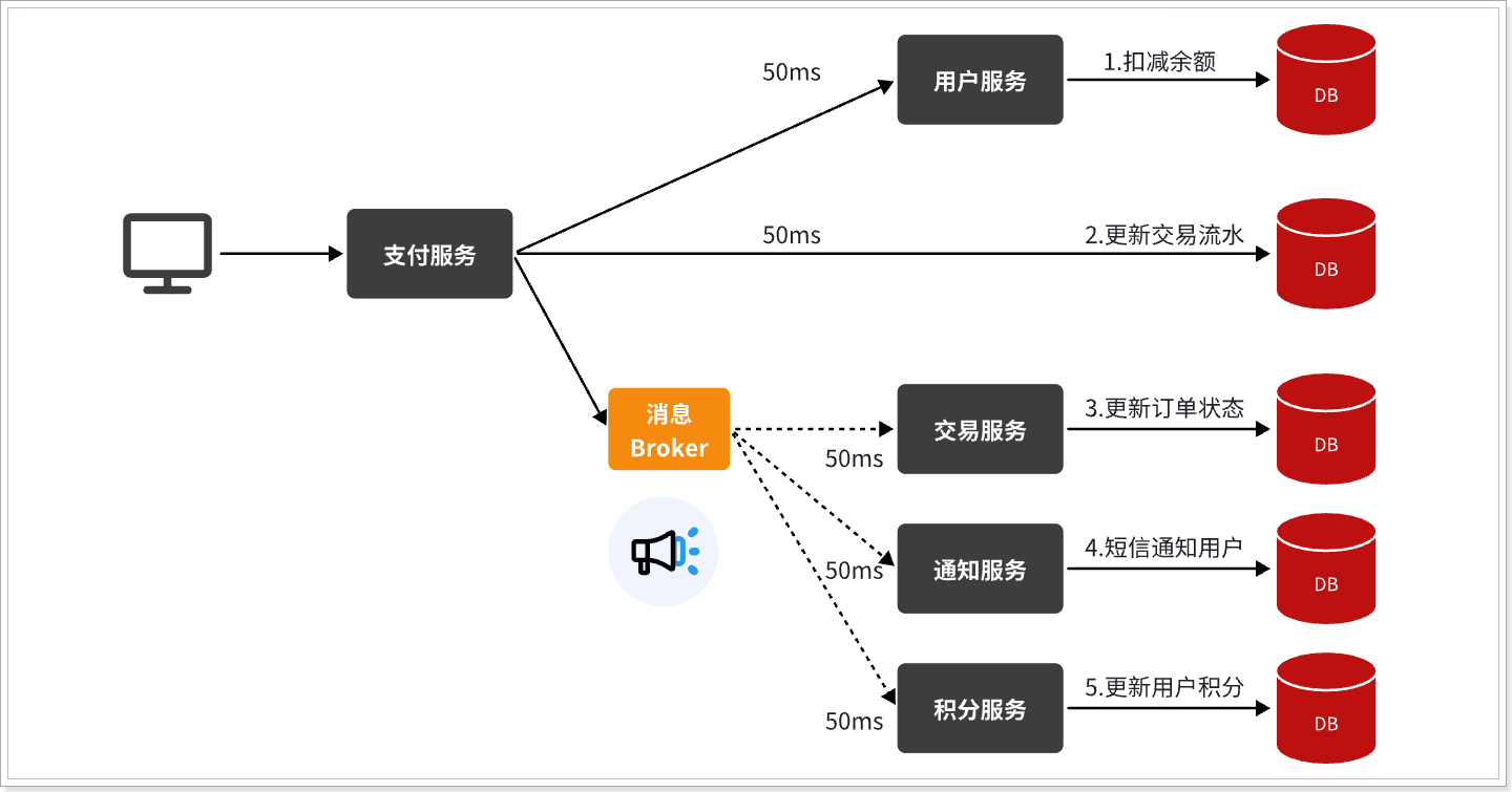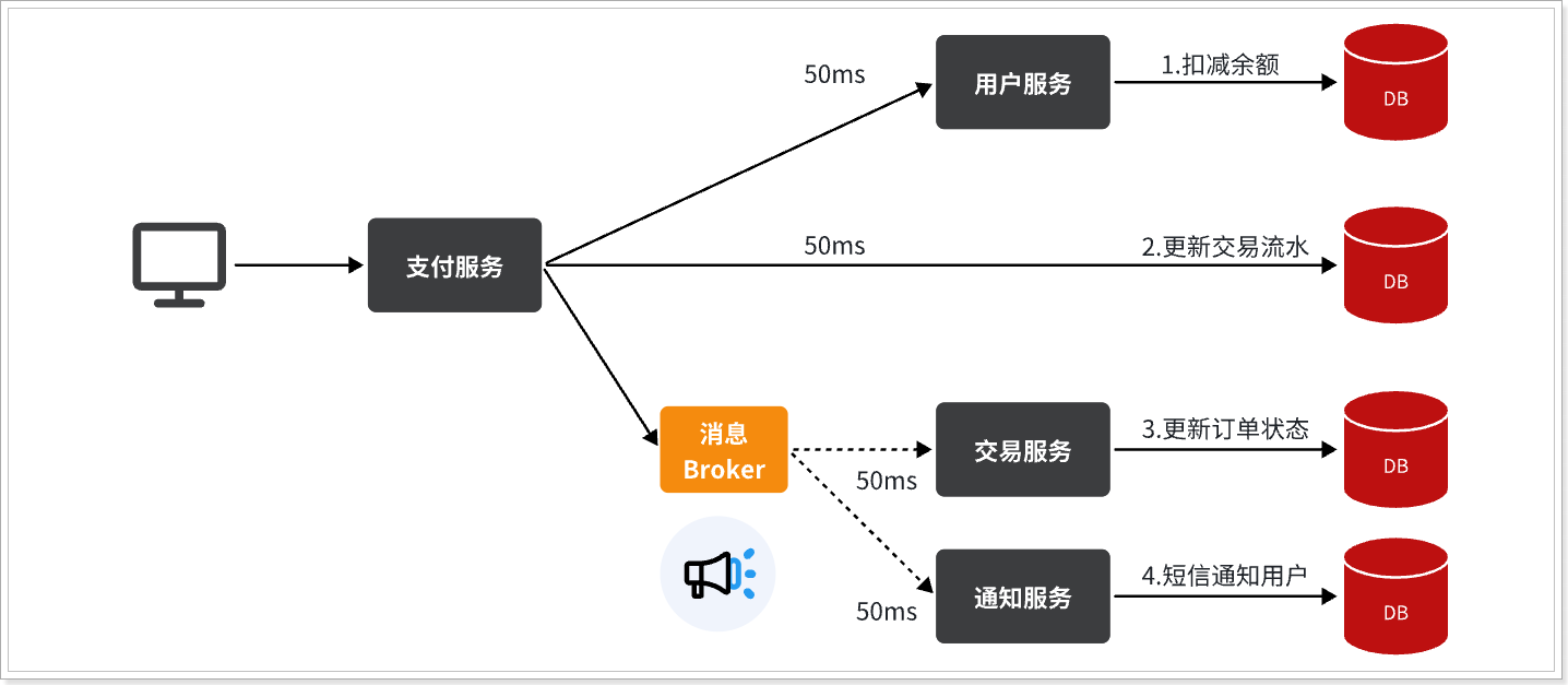 不管后期增加了多少消息订阅者,作为支付服务来讲,执行问扣减余额、更新支付流水状态后,发送消息即可。业务耗时仅仅是这三部分业务耗时,仅仅100ms,大大提高了业务性能。
