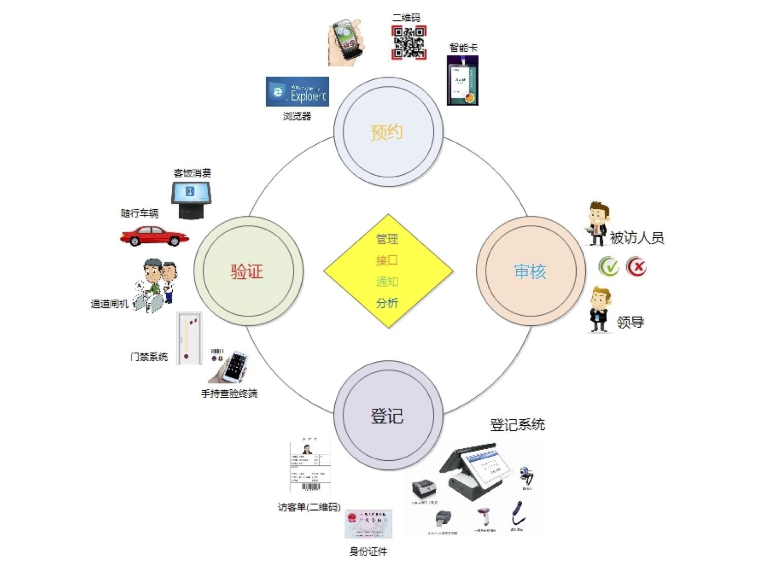 VMS.net平台是一套将线上线下访客应用融合的平台,为企事业单位,物业社区和访客用户提供一整套完整的线上访客预约,线下访客登记和安全认证的体系架构。并且提供开放的第三方接口,可与多种应用系统进行数据共享交互,例如停车管理系统,门禁系统,通道系统,消费系统等。在身份安全认证方面使用了安全快捷的离线式动态口令模式,选择了时间同步动态令牌产生二维码。令牌每次申请有效期为10分钟,并且单次使用有效。并且,身份识别可使用多种介质标识,包括:智能卡,二代身份证,二维码,手机空气签名,指纹,掌形等。