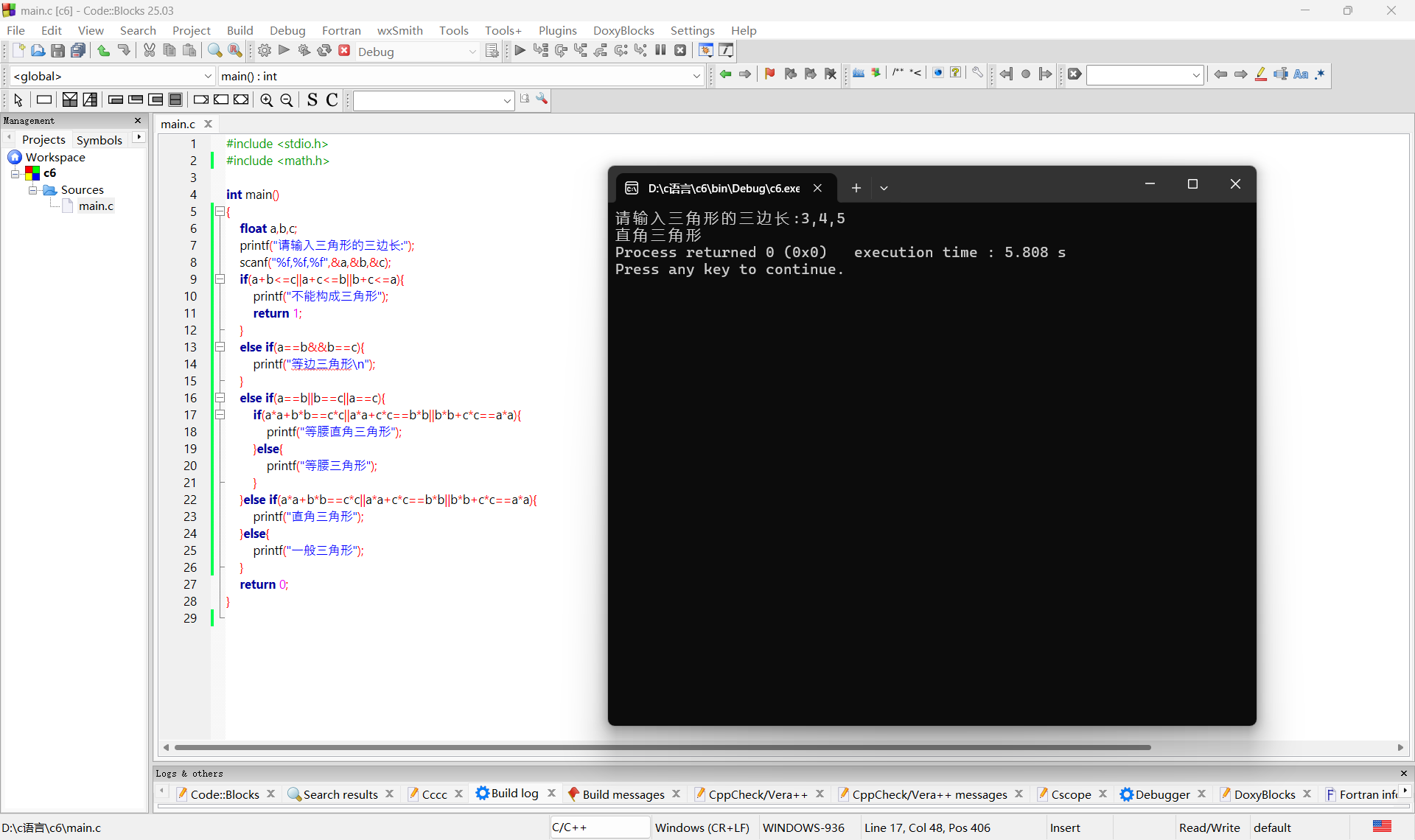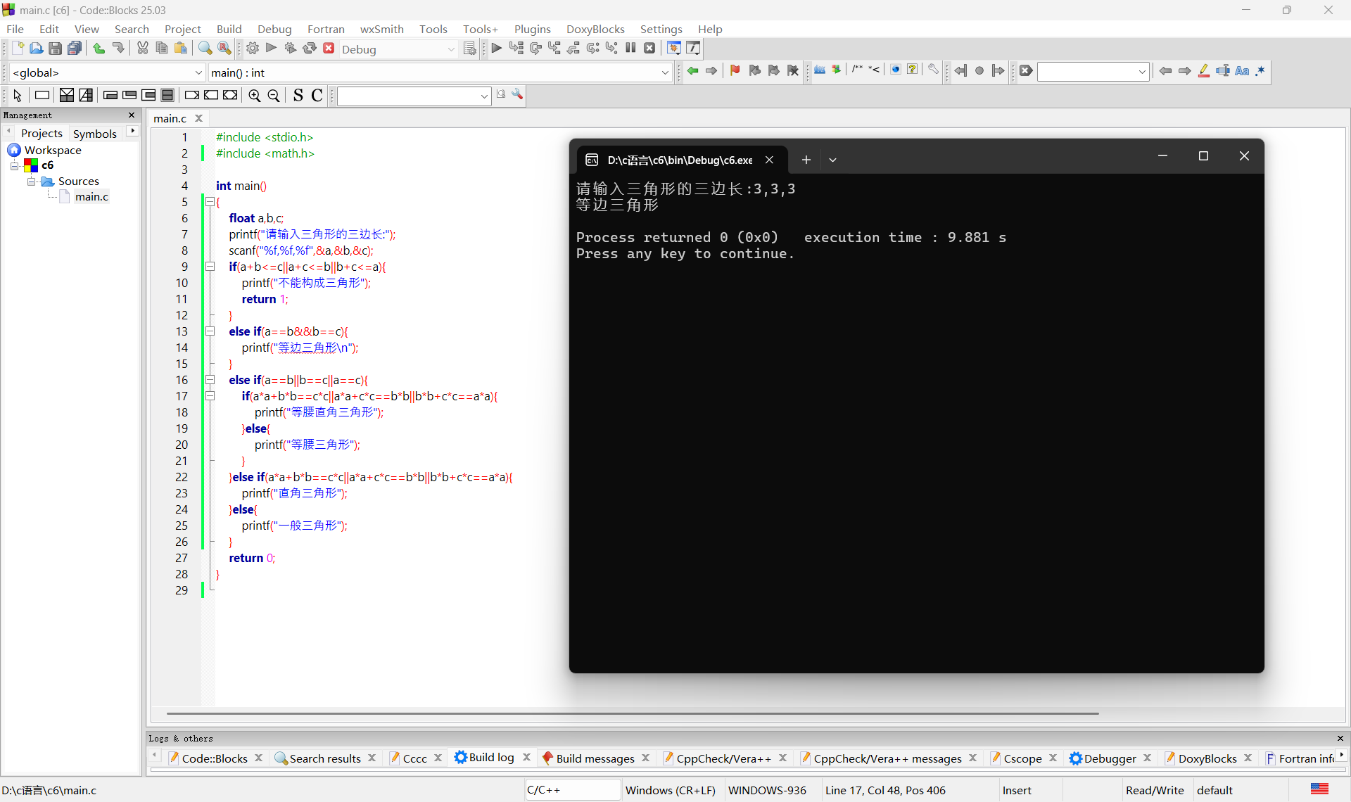 printf("请输入三角形的三边长:");