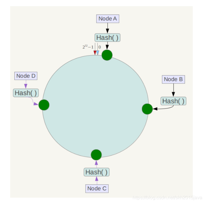 假如有4个服务器节点,分别为NodeA、NodeB、NodeC和NodeD,根据他们的IP或者服务名称计算hash值对2^32取模就可以分别得到它们在圆环上的位置。