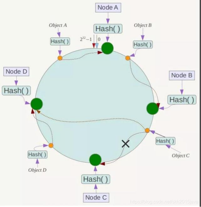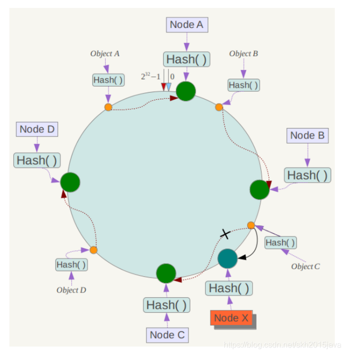 新增节点X,那么节点X到其前面一个节点(Node B)环上的对象会从原本请求的节点(Node D)调整到Node X节点上。所以一致性哈希算法有非常好的容错性和可扩展性。
