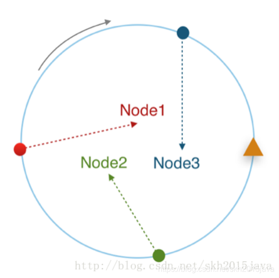 一致性哈希算法是将每个Node节点映射到同一个圆上。将各Node的key采用hash计算,可得到一个整数数组。将该数组排序后,首尾相连即是一个圆。如下图所示