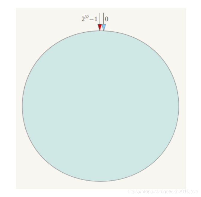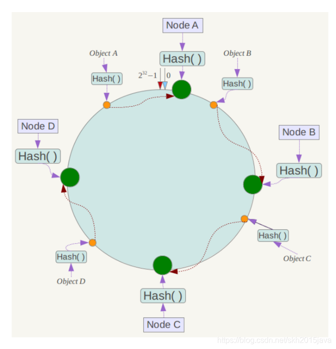 整个空间按顺时针方向组织,圆环的正上方的点代表0,0点右侧的第一个点代表1,以此类推,2、3、4、5、6……直到2^32-1,也就是说0点左侧的第一个点代表2^32-1, 0和2^32-1在零点中方向重合,我们把这个由2^32个点组成的圆环称为Hash环。