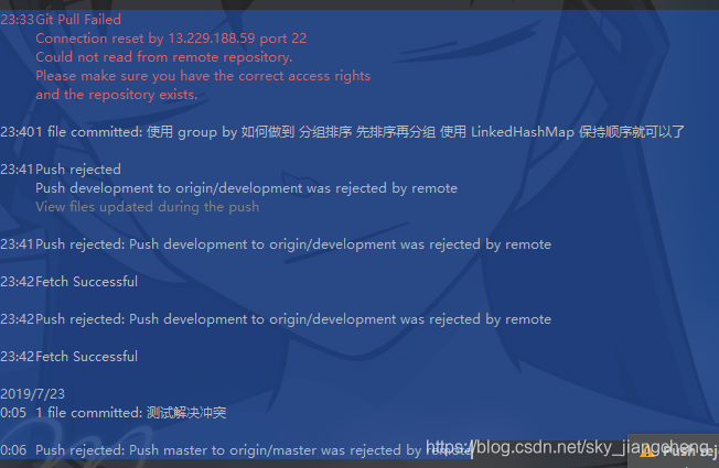今天提交代码的时候git报错了,由于昨天本地有代码没提交,在别的地方提交了代码,导致这次的git冲突,使用idea 的自动merge 失败了。如图: