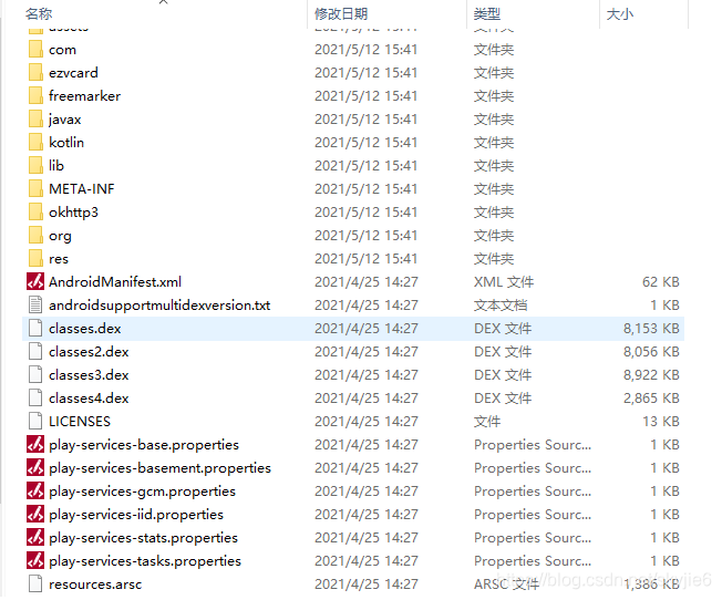 再对着apk解压(直接右键解压或改后缀名为压缩文件再解都一样),得到dex文件和各种各种杂七杂八的。甚至因为代码太多能得出好几个dex