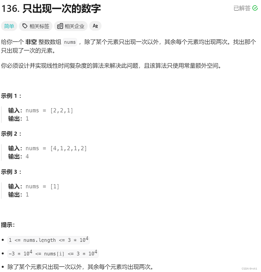 这篇文章介绍了如何使用Java编程解决一个问题,通过异或运算找出数组`nums`中唯一出现一次的整数。代码展示了异或操作的性质,如对任何数与0异或结果保持不变,以及满足交换律和结合律。