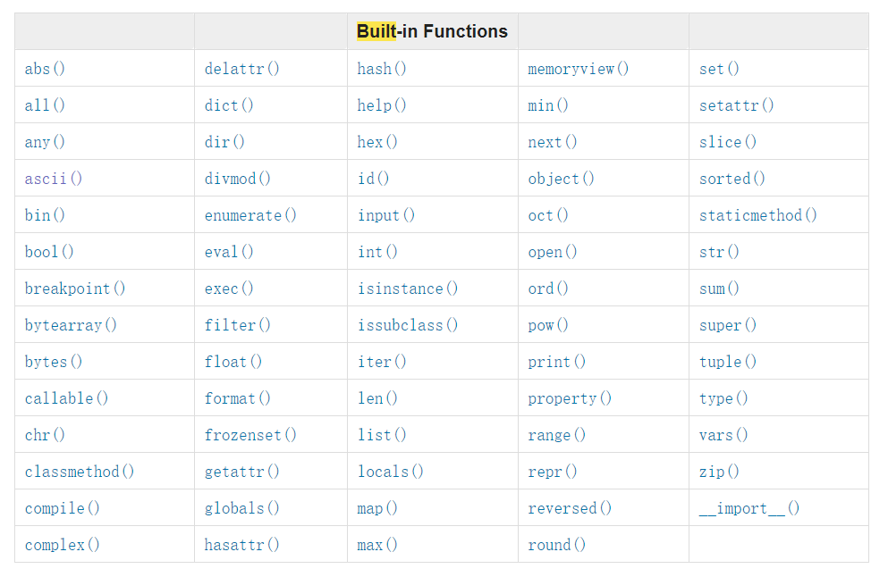 更多内置函数:https://docs.python.org/3/library/functions.html?highlight=built#ascii