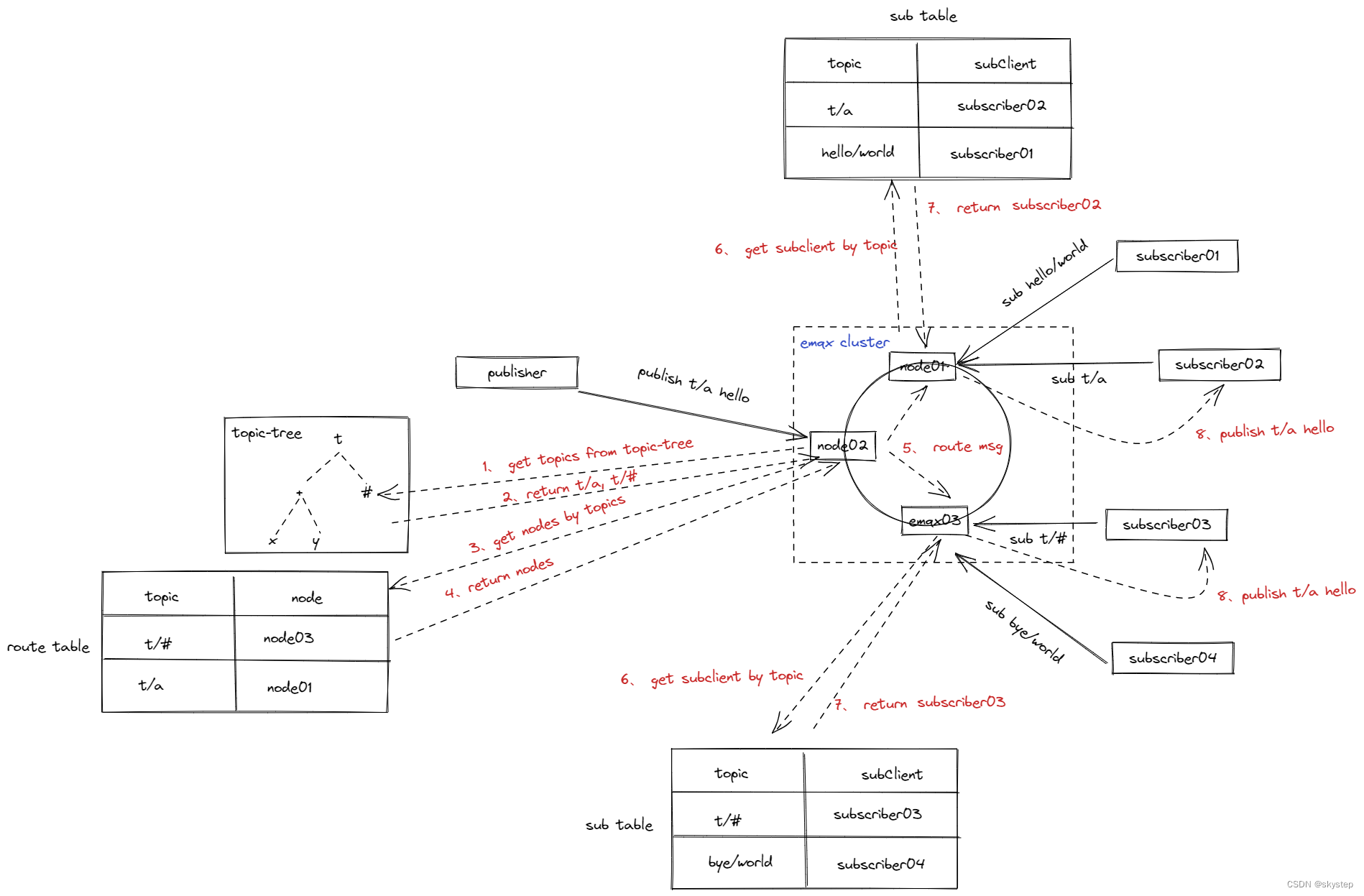 - node01 和 node03 获取到消息;根据各自的订阅表,得知:node01 上有 sub02 订阅了 t/a,node03 上有 sub03 订阅了 t/#;