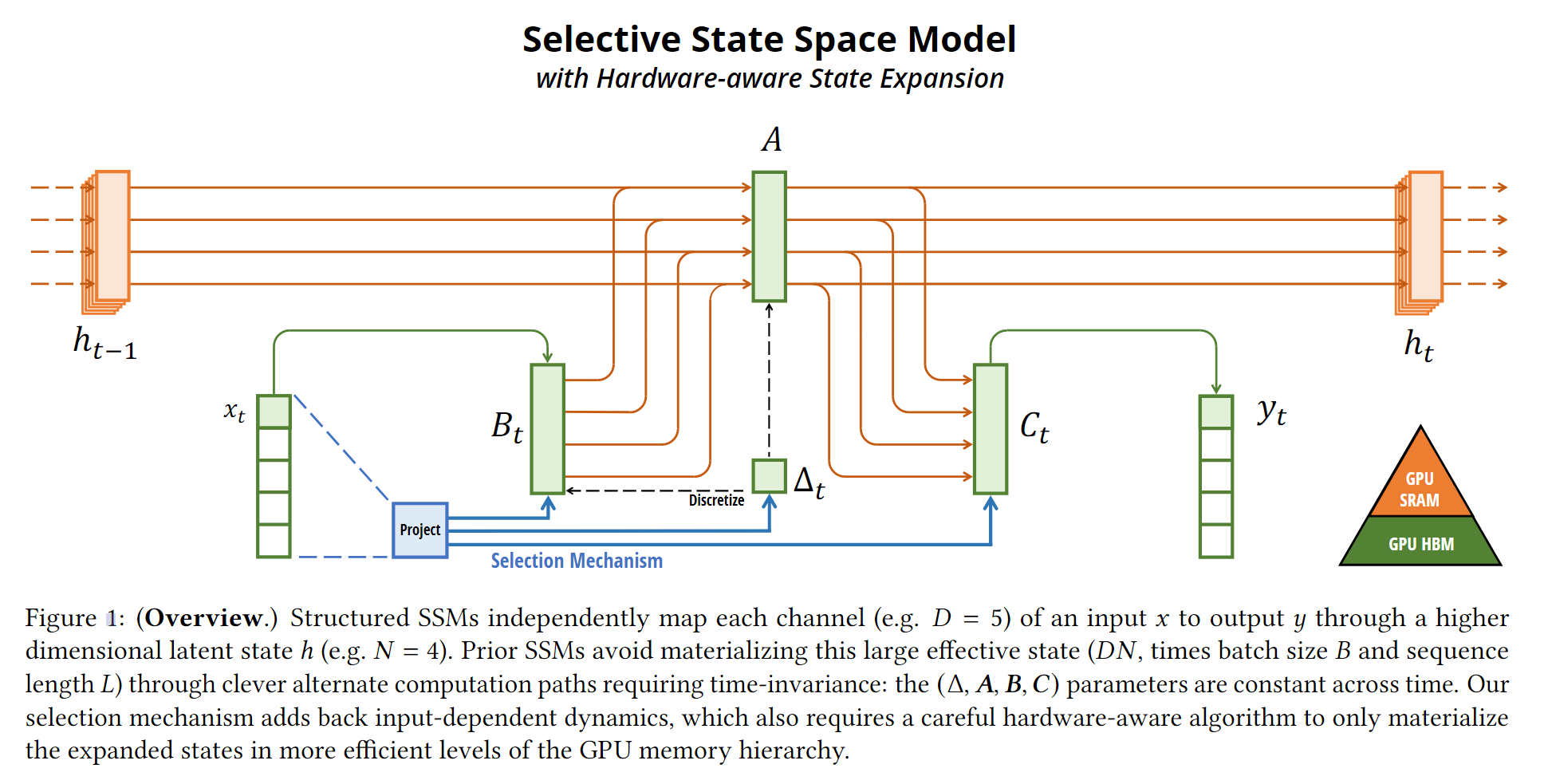 Mamba 的模型框架,硬件感知算法(某些值可能过大 在 SRAM 中无法存储,Manba 的思想是将其重算):