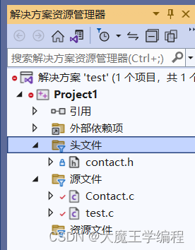 博客介绍了C语言程序开发时新建的3个项。test.c用于编写程序整体功能,Contact.h存放程序所需函数声明和要调用的头文件,Contact.c存放程序需要的函数。