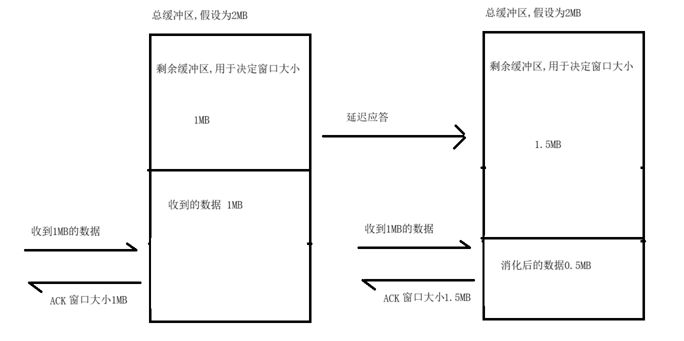 假设,接收方的接收缓冲区有2MB,在接收1MB的数据后,立刻返回ACK,这个ACK的窗口大小就是1MB.如果让ACK的返回稍微延后,接收方就能"消化"一些缓冲区的数据,在等待的时间里接收方消化了0.5MB的数据,那么就让ACK中的窗口大小从1MB扩大到1.5MB.毕竟窗口越大,网络的吞吐量越高,TCP为了在不拥堵的前提下尽可能的提高网络的吞吐量,就引入了延迟应答.