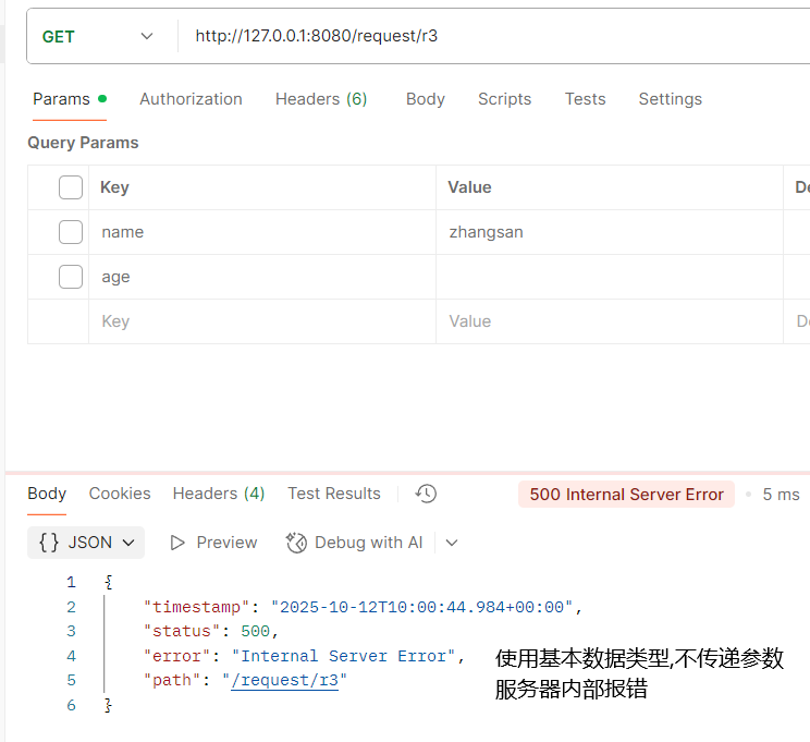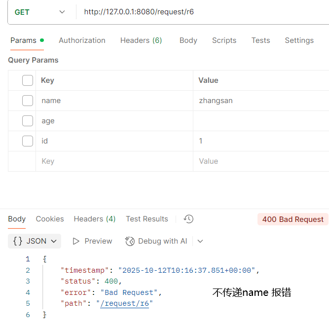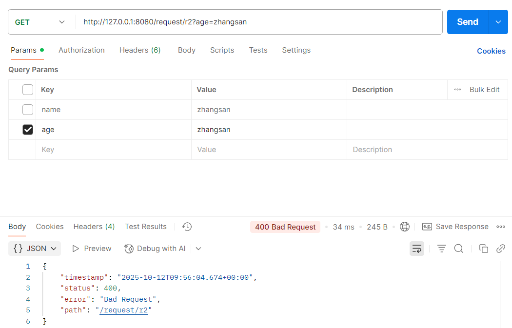 2025-10-12T17:57:14.077+08:00 WARN 65084 --- [nio-8080-exec-3] .w.s.m.s.DefaultHandlerExceptionResolver : Resolved [org.springframework.web.method.annotation.MethodArgumentTypeMismatchException: Failed to convert value of type 'java.lang.String' to required type 'java.lang.Integer'; For input string: "zhangsan"]