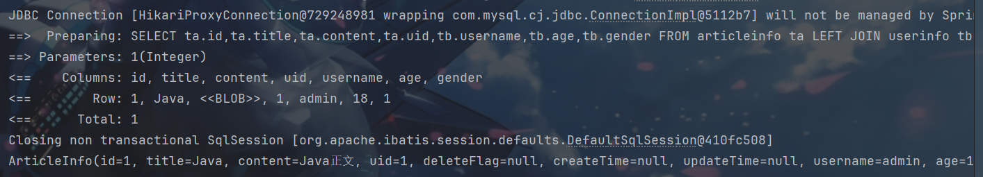 查询sql:SELECT ta.id,ta.title,ta.content,ta.uid,tb.username,tb.age,tb.gender FROM articleinfo ta LEFT JOIN userinfo tb ON ta.uid = tb.id WHERE ta.id = #{id}