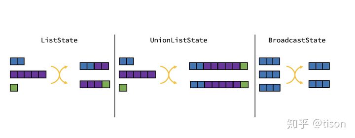 OperatorState 支持 SPLIT_DISTRIBUTE(ListState)/UNION(UnionListState)/BROADCAST(BroadcastState) 三种类型,它们在改变并发的时候重新划分的逻辑如下图所示。