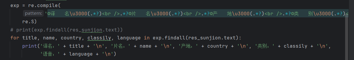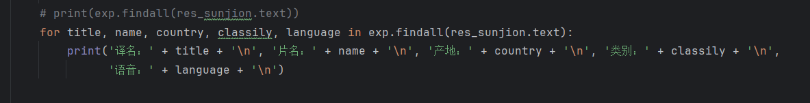 for title, name, country, classily, language in exp.findall(res_sunjion.text):