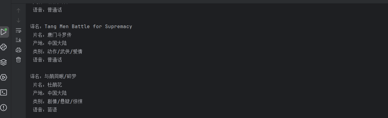 print('译名:' + title + '\n', '片名:' + name + '\n', '产地:' + country + '\n', '类别:' + classily + '\n',