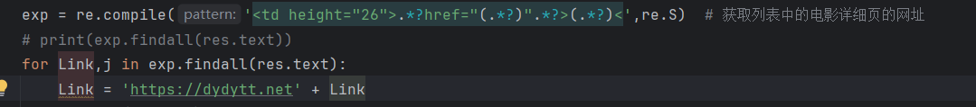 exp = re.compile('<td height="26">.*?href="(.*?)".*?>(.*?)<',re.S) # 获取列表中的电影详细页的网址