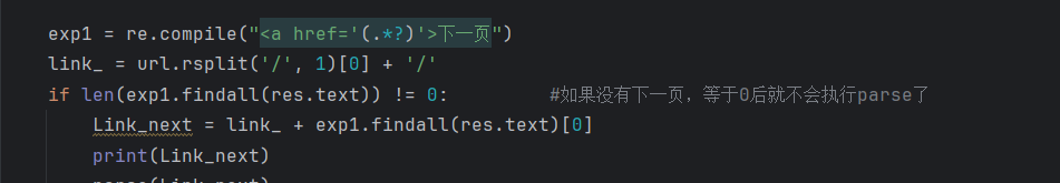 if len(exp1.findall(res.text)) != 0: #如果没有下一页,等于0后就不会执行parse了