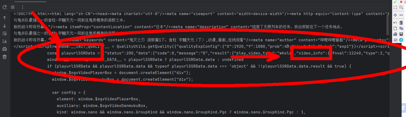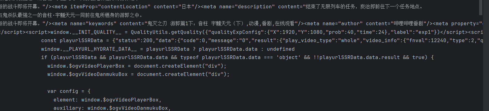 在分析返回的html中,我们可以发现,我们要爬取的视频资源内容全在一个playurlSSRData的字典里边,并且里边有视频信息这样的关键字,如下图: