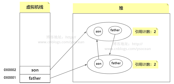 father对象和son对象,其引用计数第一个是栈内存指向,第二个就是其属性互相引用对方,所有引用计数器都是2。