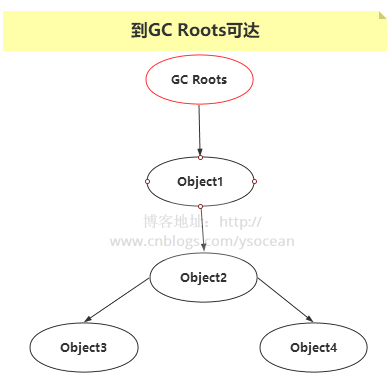 上图Object1,Object2,Object3,Object4到GC Roots是可达的,所以不会被作为垃圾回收。