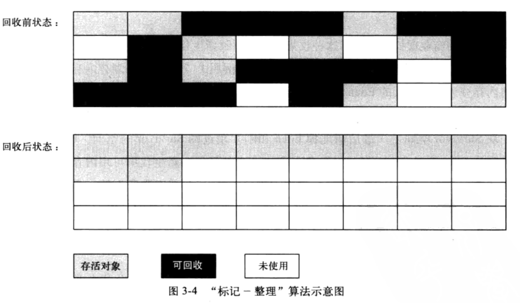 2、对于存活周期较长,没有额外空间进行分配担保的区域,采用标记-整理算法,或者标记-清除算法。