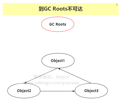 上图Object1,Object2,Object3这三个对象互相引用,但是到 GC Roots不可达,所以都会被垃圾回收掉。