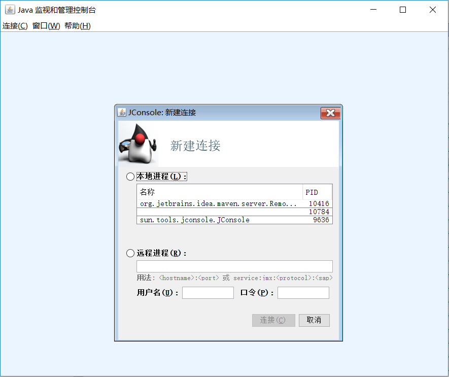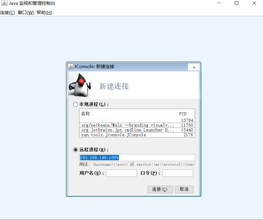 通过上面的配置,启动Tomcat后,我们只需要在 JConsole 的远程连接界面,输入 192.168.146.200:9004 ,然后点击连接即可。
