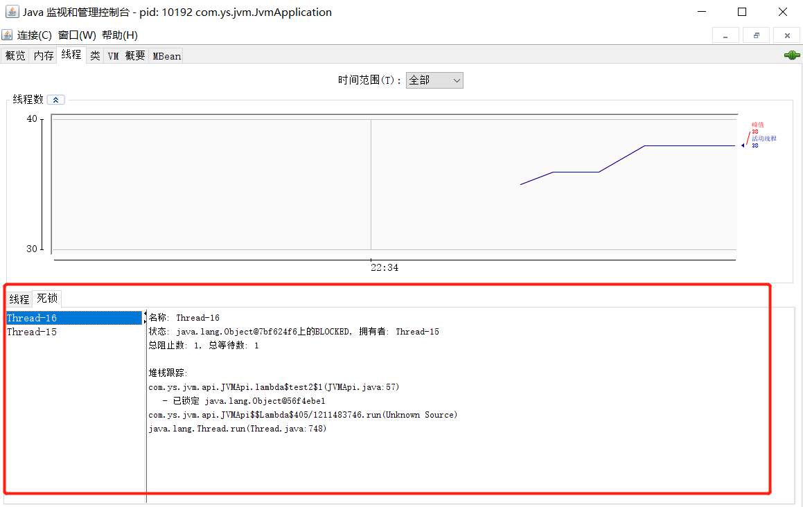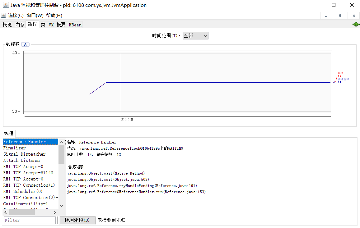 另外,此页面左下角还有一个检测死锁的按钮,出现线程死锁后,点击此按钮,便会出现一个新的死锁页签。