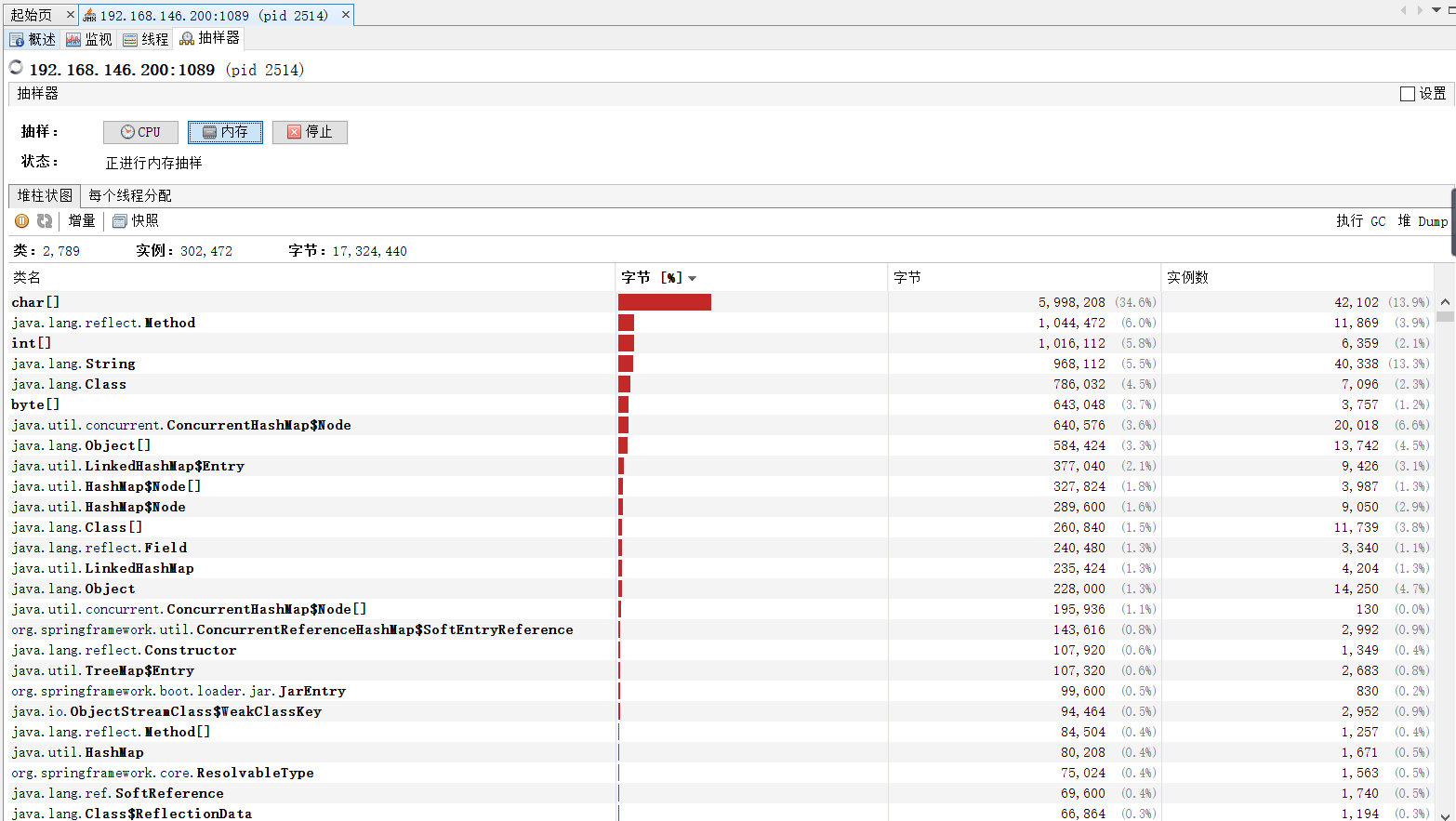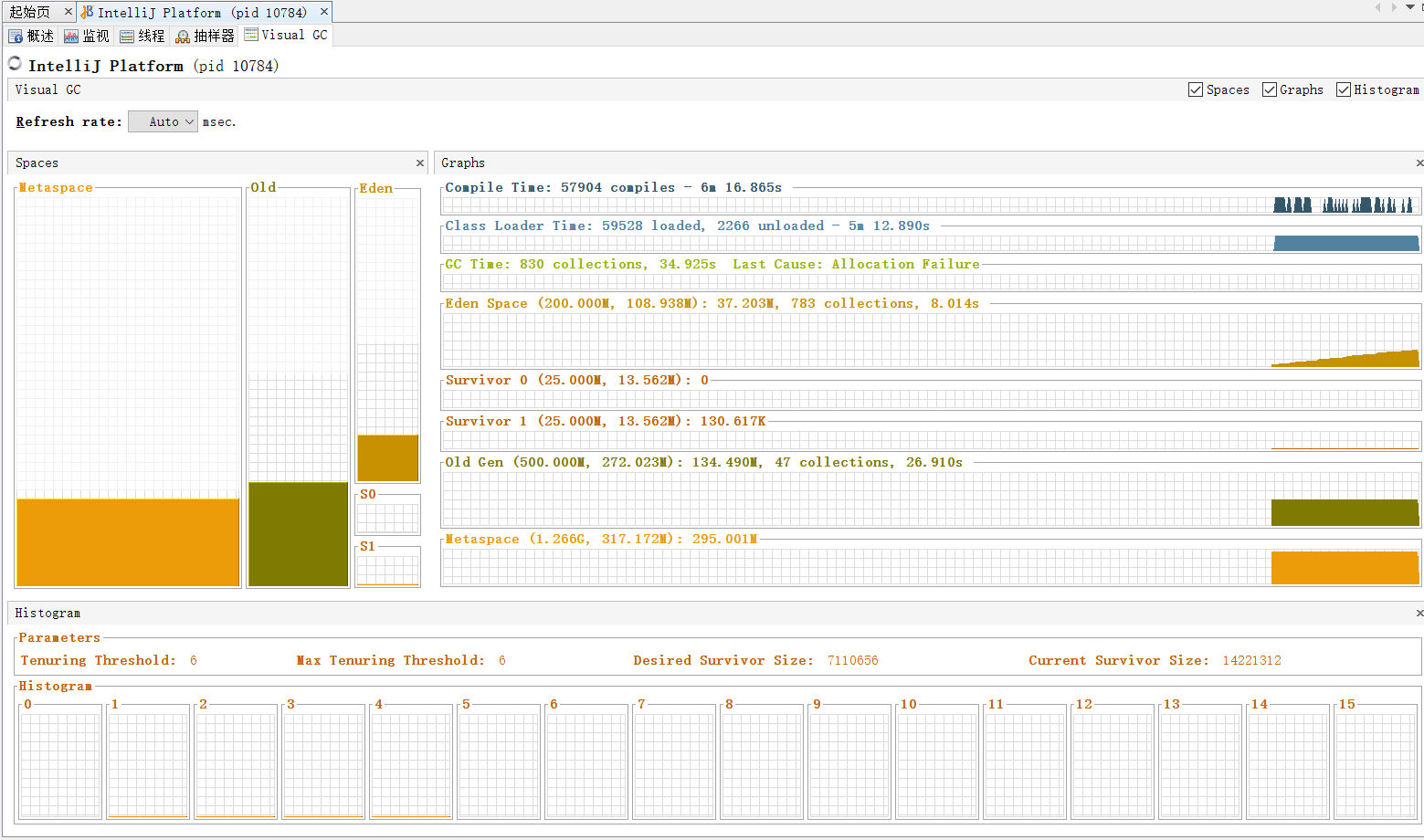 这个页签相当于上篇博客介绍的可视化的jstat 命令。遇到线程停顿的时候可以使用这个页签进行监控分析。