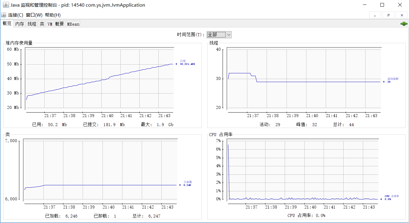 这个界面是我们建立本地连接后,进入的第一个页面。显示的是整个虚拟机主要运行数据的概览,包括“堆使用情况”、“线程”、“类”、“CPU占用率”等四项信息的曲线图,这些曲线图是后面“内存”、“线程”、“类”页签的信息汇总,下面会分别介绍这几个页签。