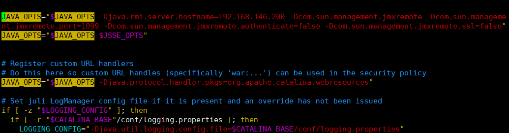 JAVA_OPTS="$JAVA_OPTS -Djava.rmi.server.hostname=192.168.146.200 -Dcom.sun.management.jmxremote -Dcom.sun.management.jmxremote.port=1099 -Dcom.sun.management.jmxremote.authenticate=false -Dcom.sun.management.jmxremote.ssl=false"