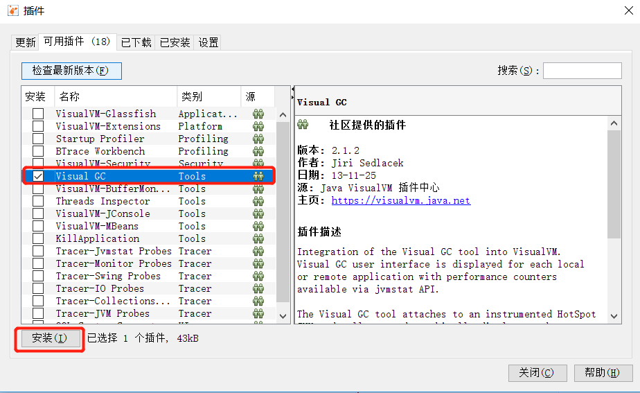 设置好下载地址后,我们这边选择需要的插件,点击安装即可!比如比较常用的插件 Visual GC(用来查看GC日志)