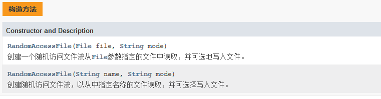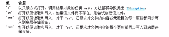 这里面第二个参数:String mode 有以下几种形式:(ps:为什么这里的值是固定的而不弄成枚举形式,不然很容易写错,这是因为随机访问流出现在枚举类型之前,属于Java 历史遗留问题)