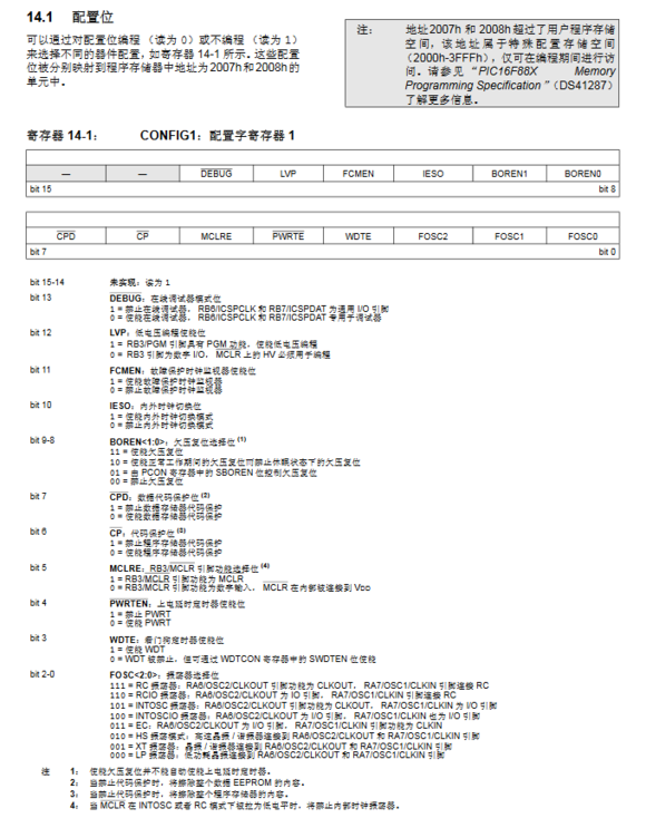 PIC单片机配置位很重要,相当于AVR单片机的熔丝位,以下是官方文档对于配置位的说明,如下图