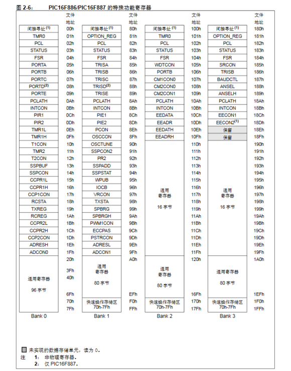 下图是PIC16F886特殊功能寄存器,每个型号的特殊功能寄存器不太一样,需要查看芯片数据手册