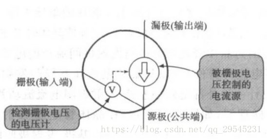 下图是FET内部工作的原理图。FET对加在栅极与源极之间电压不断的监视,控制漏极与源极之间的电流源,使流动